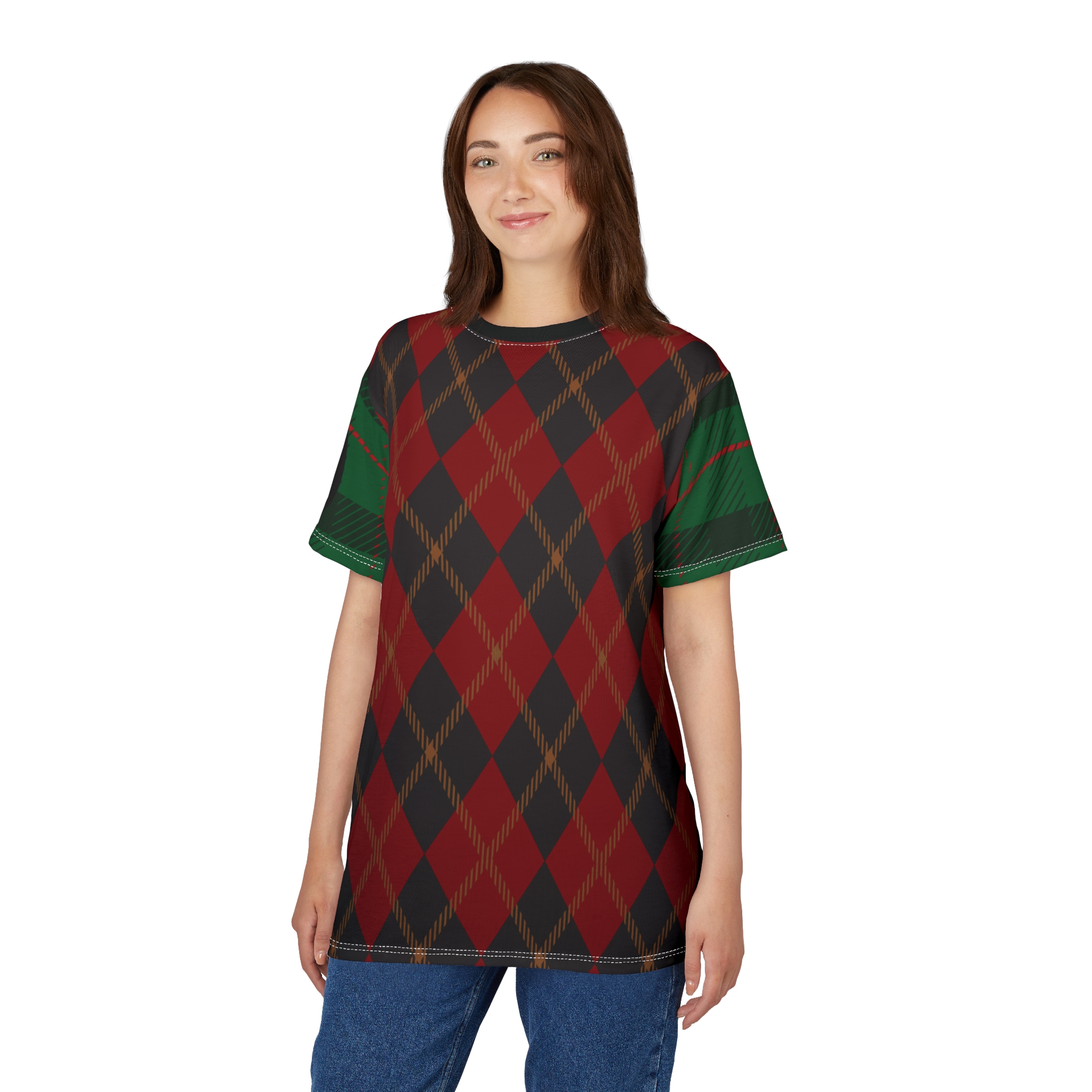 This All-Over Print tee brings cozy, vintage lodge style into everyday wear. The deep red and black argyle pattern, warmed by subtle brown lines, pairs with forest-green sleeves for a cabin-ready look that feels familiar and quietly bold. Lightweight, breathable polyester lets the colors stay vivid while the cut-and-sew construction keeps the pattern aligned and wearable as the seasons change. Wear it on brisk hikes, layered under a flannel at a winter gathering, or while sipping coffee by a window fogged with morning chill. The tagless collar and regular fit make it comfortable for long days on the trail or evenings around a fire. This shirt speaks to people who like timeworn patterns turned lively — those who collect quiet rituals like weekend drives, thrifted finds, and slow mornings.